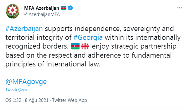 Azərbaycan beynəlxalq səviyyədə tanınmış sərhədləri çərçivəsində Gürcüstanın müstəqilliyini, suverenliyini və ərazi bütövlüyünü dəstəkləyir.